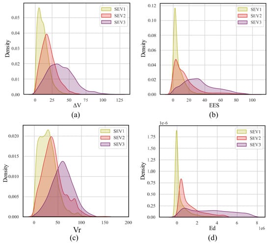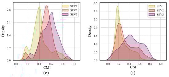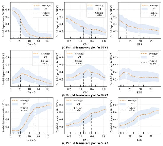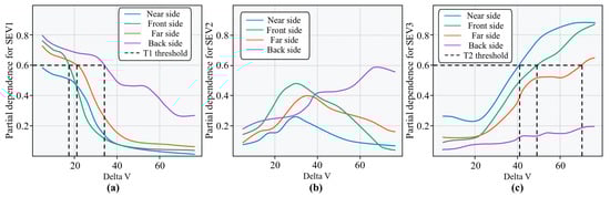 The partial dependence at each severity level has been integrated to further quantify the impact of the proposed PCIs. According to the threshold setting guidelines from the United States CDC expert panel [], the critical thresholds T1 and T2 of ΔV, CMI, and EES for three severity levels are summarized in Table 5. The criteria for threshold delineation are represented by the dashed lines labeled as T1 and T2 in Figure 8. These lines serve as a reference for the 60% acceptance rate of dependence distribution for the different severity probabilities. Values below T1 or above T2 imply that the probability of SEV1 or SEV3 will surpass the other cases.