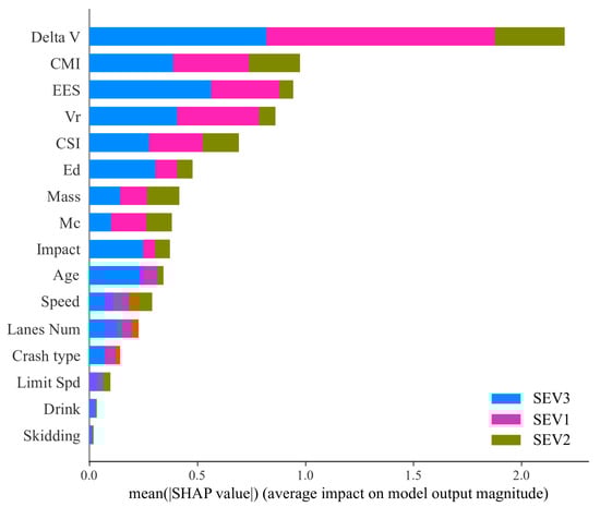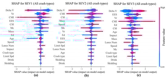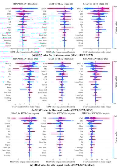 The SHAP value suggests that all six PCIs have the largest contribution in the injury severity assessment. Such a priori PCIs are derived from the well-established crash reconstruction theory, which has been proven to reflect the crash risk to a certain extent []. Based on the results, ΔV provides the best interpretation for all severity levels. We considered a sideswipe collision between two low-speed vehicles, in which the likelihood of injury is relatively minor, and the ΔV of both vehicles during the crash is equally low. When two vehicles with large differences in mass and speed have potential conflicts in the approach trajectory, the higher ΔV increases the IR in this case. With regard to system-based dimensionless parameters, the predictive performance of the CMI is higher than that of the CSI. Both indicators are related to vehicle geometry and structural stiffness. However, CSI mainly measures the energy absorbed during the crash, while different forces and deformations may correspond to the same energy loss []. By contrast, CMI is directly related to the impact eccentricity, and the increase in the impact eccentricity results in a decrease in the rate of kinetic energy converted into translation. Thus, CMI outperforms most of the other variables in side-impact crashes (Figure 7c).