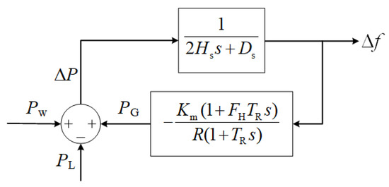The most commonly used method for frequency dynamic analysis of the power system after disturbance is the system frequency response (SFR) model [15]. This model assumes that the system satisfies the same inertia center frequency principle and, equivalently, aggregates the prime mover and governor system models of all generators in the system into the prime mover and governor system model of one generator, while concentrating the mechanical power of all generators in the system onto one generator rotor, and finally, equivalently, aggregates all loads in the system into one centralized load. The model structure is shown in Figure 1.