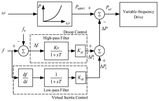 Virtual inertia control enables the WT to adjust the active reference instruction according to the rate of frequency change when the power system frequency changes by simulating the inertia characteristics of the synchronous machine to release or absorb the rotor kinetic energy for the purpose of participating in the power system frequency regulation. Specific control implementation can be referred to in Figure 2.