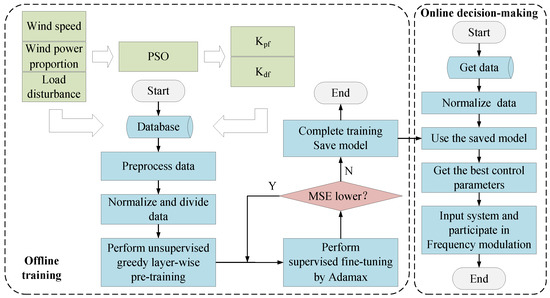 Combined inertial intelligent control of wind power frequency regulation based on deep neural network is divided into three parts: acquiring data, extracting features, and predicting parameters. Feature extraction and learning of the original combined inertial control is performed to improve and optimize the control strategy. PSO is first applied to obtain combined inertial optimal control parameters in the simulation and combined with the scene data to generate the data sets. Then, CAE is used to extract data features from the data sets. Finally, DNN is used to learn the features so that the optimal combined inertial control parameters are quickly obtained when making decisions online. It is primarily categorized into two components: offline training and online decision-making.