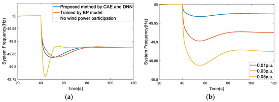 Online decision-making is carried out using the methods described above in a system scenario where the wind speed is 6 m/s, the wind power proportion is 30%, and the load disturbance is 0.05 p.u., starting at 40 s. In this scenario, the performance of combined inertial control with BP training parameters is compared with frequency control without wind power participation. The results of frequency control are presented in Figure 10a.