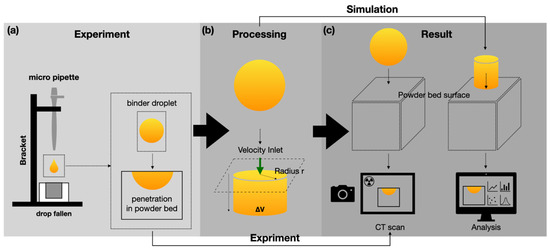 Figure 1 represents a schematic diagram of this study. We used a micropipette to inject different volumes of binder into the powder bed to carry out the penetration experiments and used the simplified model of ANSYS Fluent for simulation analysis. Afterward, the experimental results and analysis results were compared and verified.