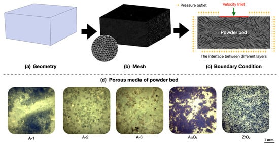 In this study, SiO2 (A-1, A-2, A-3), Al2O3, and ZrO2 sand powders, as shown in Figure 2d, commonly used in 3D printing, were used to simulate and analyze binder volumes of 0.1, 0.5, 1.0, 1.5, 2.0, and 2.5 µL. The silica sand was divided into three different particle sizes. Five sets of simulations and experimental comparisons were carried out.