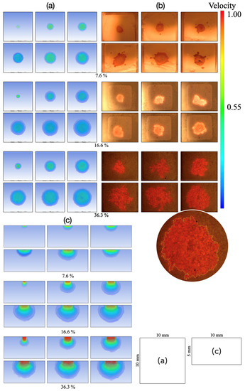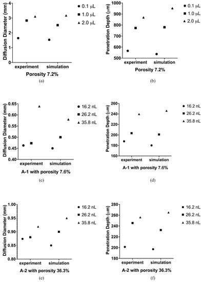 Given the large number of samples and experimental items, it was not feasible to provide all of them. Thus, we presented the selected simulation and experimental results in Figure 3 and Figure 4. In Figure 3, we used the conversion method to drop binder volumes of 0.1–2.5 µL into porosities of 7.6, 16.6, and 36.6%, which cover the various powder parameters used. In Figure 4, we dropped a binder volume of 1.0 μL into porosities of 7.6, 16.6, 36.3, and 40.7%. Using CT scans, we obtained the penetration depth and diffusion diameter and obtained several insightful results depicted in Figure 4. Ultimately, all the simulation and experimental data were organized into graphs for clear representation in Figure 5.