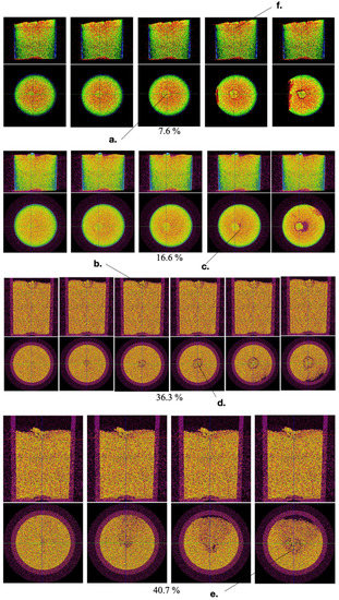 We determined the penetration of the binder in the powder bed using CT scans and compared the results with the simulation results. It can be seen that Pinf is related to porosity and particle size. As the binder volume increases, Pinf becomes more significant. However, if the porosity is too great, the binder will continue to infiltrate downward until resistance with the particle surfaces balances the force of penetration. Conversely, if the particle size range and porosity are small, the binder is more likely to be retained between the particles [40,41,42], decreasing the Pinf of the binder. When the porosity exceeds a certain value, the permeation shape gradually becomes cylindrical, which is most obvious when porosity exceeds 36.3%, according to the simulation results in this paper. Figure 4 shows that the affected particles were displaced after being combined with the binder. Moreover, it presents a somewhat spherical penetration range.