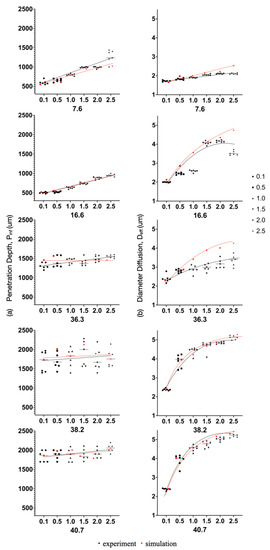 Figure 5 shows all samples and analysis results in a statistical chart of Pinf and Deff data for six different binder volumes in order of increasing porosity. The red line segments and sample points represent the simulation results, and the black line segments and sample points represent the experimental results. When porosity is low, the Pinf presents a quadratic curve distribution and generally ranges between 500–1500 µm. However, as porosity increases, the overall diffusion depth increases significantly, and the trend line tends to close to a straight line. The result is that the binder cannot be retained between the particles. It infiltrates downwards, driven by inertia and gravity [37,38]. If porosity is low, the surface force between the particles increases, which increases the resistance of the particles to infiltration, resulting in a decrease in Pinf (but with little effect on Deff), thereby increasing the precision of the mold after molding. The results obtained by the simplified model proposed in this experiment are the same as the quadratic curve trend resulting from the experiments. If binder volume and porosity are used as the main variables, the Pinf and Deff results are almost identical at lower porosities. However, when the porosity exceeds 35%, the Pinf prediction results of the simplified model produce significant errors. The reason for this is that there are still many uncertainties in permeability processes under conditions of high porosity [40]. As binder jetting technology improves, studies and equipment are moving toward smaller particle sizes, which means that low porosity is becoming a trend in high-precision, high-strength binder jetting. Therefore, the simplified model proposed in this study still has a high reference value.