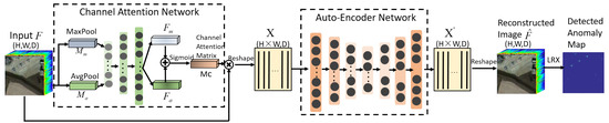 In this paper, a hyperspectral anomaly detection algorithm based on the channel attention mechanism and LRX is proposed, as illustrated in Figure 1. The algorithm follows a two-step process: first, it obtains the reconstructed image using the auto-encode network with the channel attention mechanism, and then uses the LRX algorithm for anomaly detection on the reconstructed image. The auto-encode network based on the channel attention mechanism consists of two sub-networks: the channel attention network and the auto-encoder network. The channel attention network is designed to extract the effective bands of HSIs as input in order to focus on the separability of the spectral bands. Meanwhile, the auto-encode network performs encoding and decoding operations on the HSIs, incorporating the channel attention mechanism. This process can effectively reduce the noise and can generate the representative reconstructed image that accurately captures the characteristics of the land covers. Finally, the LRX algorithm is utilized to the representative reconstructed image to better detect anomalies.