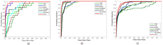 ROC curves of six comparative algorithms and the proposed algorithm on three data sets: (a) HYDICE urban data; (b) AVIRIS airplane data; (c) Salinas scene.