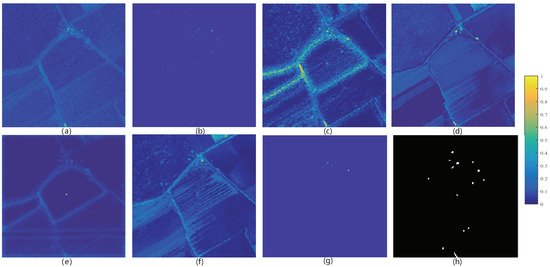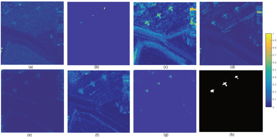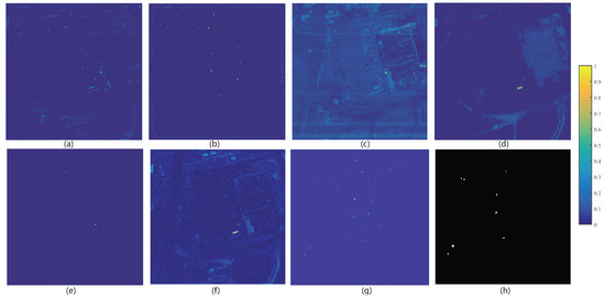 Visualized anomaly detection results of different algorithms on AVIRIS airplane data set: (a) LRX; (b) BJSR; (c) LRaSMD; (d) MCRD; (e) AE-based; (f) AUTO-AD; (g) ours; (h) ground truth.