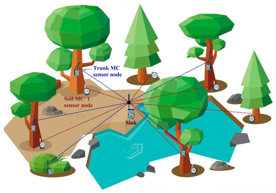 The overall architecture of the forestry IoT for trunk MC monitoring.