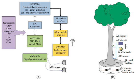 The prototype of designed wireless sensor nodes: (a) architecture of the wireless AE node; (b) architecture of the soil moisture sensor.