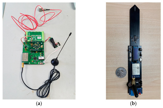 Actual sensor node installation diagram: (a) deployment of the soil MC node; (b) testing of the wireless AE node.