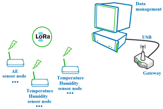 The whole system structure diagram is depicted in Figure 4. It contains three main elements: (1) the wireless nodes, which are in charge of sensing the AE signals and environmental parameters, along with transmitting the featured data to the sink through wireless communication; (2) the gateway, which has a strong computational ability and is able to coordinate the whole wireless network and gather all the sensor nodes’ data; and (3) the diagnostic program, which provides the intelligent learning functionality through the fusion of the AE signal and environment parameters’ individual scores.