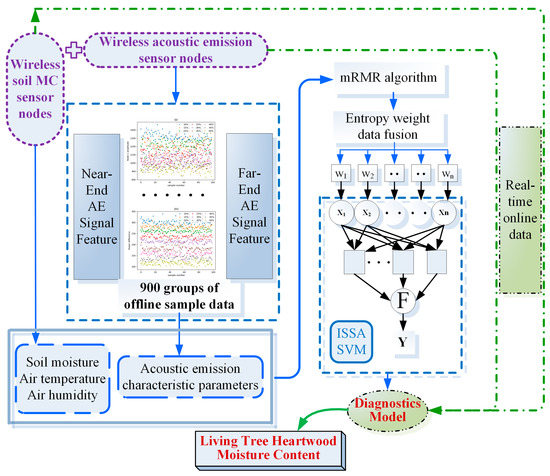By collecting the AE characteristic parameters on the bark, soil MC value around standing trees’ roots, air humidity, and temperature information at DBH as a whole sample dataset, the MC level of the living tree heartwood can be detected by an intelligent multi-sensor data fusion algorithm. The main idea is to first adopt the mRMR algorithm for an optimal feature dimension reduction. Next, the selected feature would be fused by using the conditional entropy weight method. Then, the enhanced SVM model is used to establish an offline diagnosis system, and the ISSA is employed to optimize the operational parameters, which further improves the model’s generalization ability and overcomes the overfitting issue. Finally, the devised model is applied to the online long-term multi-sensory MC prediction adaptively and efficiently.