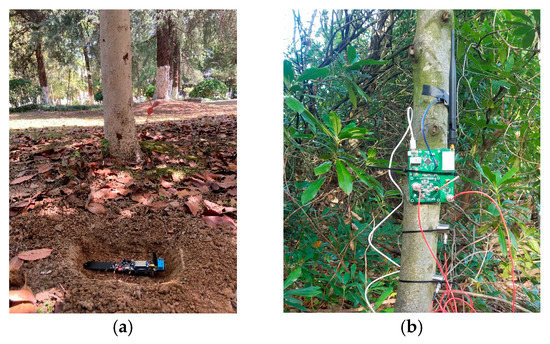 The soil MC nodes were placed about one meter away around the tree root [34], and they were buried in the soil with flags on the ground. In this paper, three underground nodes with 10 cm and 20 cm depths were used for demonstration, respectively, and were parted in a circle by 120 degrees around the center of the root.