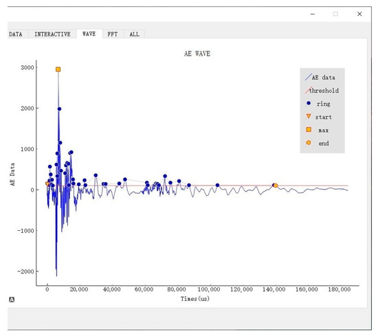 Figure 6a shows the field installation scene of soil MC nodes, while Figure 6b and Figure 7 display the AE nodes’ on-site diagram and data acquisition exhibition interface. As can be seen, AE feature parameters such as amplitude, rise time, duration, ring count, and signal energy can all be precisely measured and calculated.