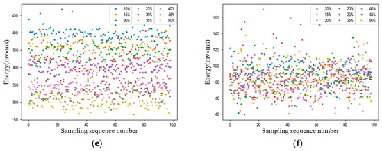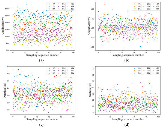 First, refer to the international standard ISO 13061-1:2014 [35]; the beech samples with MC levels of 10%, 15%, 20%, 25%, 30%, 35%, 40%, 45%, and 50% (error ± 2%) were prepared correspondingly. The WASN nodes, as shown in Figure 3, were used to collect the AE parameters. Note that the wood samples and AE sensors were coupled by Vaseline to enhance the signal transmission capability. The AE nodes were sampled 100 times for each of the 9 specimens, and every set of data contained the following outputs of the near/far-end AE signals: amplitude, rise time, duration, ring count, and energy, along with the difference value between the near/far-ends signal, which was 15 parameters in all. Some of the results are presented below in Figure 8.