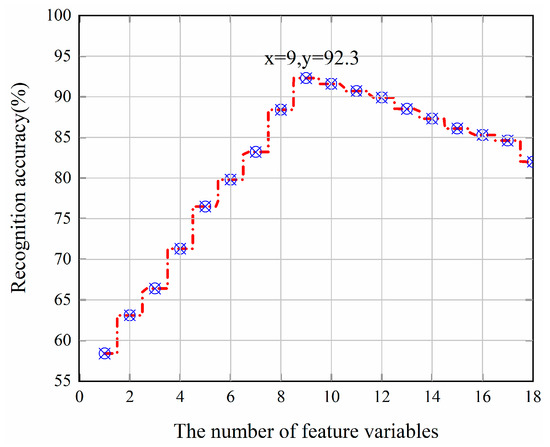 Furthermore, when the number of optimal features gradually increased from the minimum to the maximum, an SVM training and testing configured with default parameters, and the corresponding recognition accuracy would be obtained, as shown in Figure 9. The analysis indicates that when the top nine features are used to construct the feature subsets, the recognition accuracy reaches an optimum value of 92.3%, and after that, the accuracy declines rapidly. Therefore, the first nine features obtained by the mRMR selection module are adopted to participate in the MC diagnosis procedure afterward.