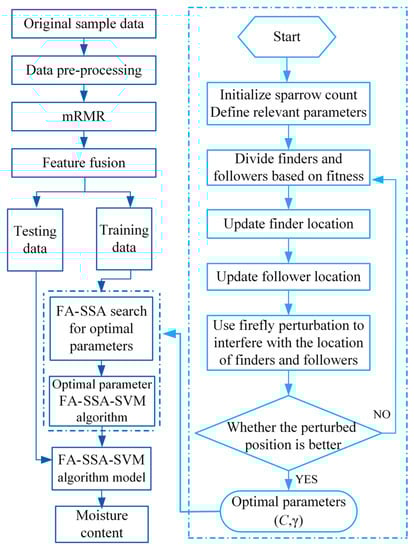 - The Maximum Correlation and Minimum Redundancy (mRMR) algorithm is used to screen out the optimal feature subset related to the MC condition of a standing tree trunk, and then data fusion is performed based on a conditional information entropy weight mechanism. After that, an SVM model is adopted to diagnose the MC status, and a firefly disturbance strategy is used to improve its global searching ability. So, the hyper-parameters have been optimized by this improved sparrow search algorithm (ISSA).
