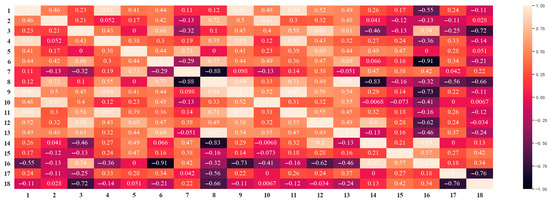 X and Y in (23) are two individual characteristic parameters, is the standard deviation, and Cov(X, Y) is the corresponding covariance. The correlation between each two of the first eighteen characteristic parameters in this paper can be obtained by calculation according to (23), and its correlation analysis heat map is shown in Figure 11.