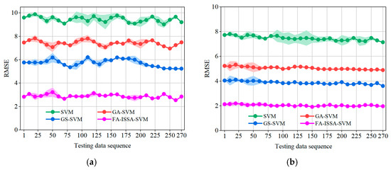 In this part, the average validation indicator root-mean-square error (RMSE) and confidence interval are used for observation. We notice that in the two figures, the RMSE of the four SVMs after entropy weight data fusion decreased by about 25% compared with the unfused data. More obviously, the fluctuation of all RMSEs decrease, especially the confidence interval of the FA-ISSA-SVM, which approaches zero, which could be almost ignored. The reason is that the advantage of the entropy weight data fusion adopted in this paper lies in the dynamic allocation of the fusion weights according to the difference between the original information entropy and the conditional information entropy, which can achieve the optimal effect of minimum error fluctuation in the global data fusion.