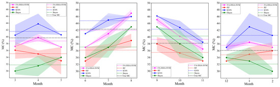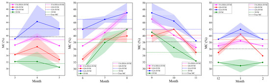 Afterward, to verify the reliability of the proposed multi-sensory information fusion system for the living trees, commercial equipment is adopted to calibrate the true values of MC level, the KT-80, a dual-function wood moisture measuring instrument from KLORTNER Technology, Italy [42]. We have carried out a measurement campaign on four typical tree species in Nanjing Forestry University (metasequoia, lodgepole pine, hovenia acerba, and a cherry–apple tree) in a monthly cycle from October 2021 to November 2022. The collected data includes the AE parameters, the root MC value, air humidity, and temperature. Because of the numerical fluctuation caused by seasonal variation, the FA-ISSA-SVM and the other six models (GA-SVM, GS-SVM, SVM, RF, KNN, Bayes) were used to analyze the feature parameters and compare identification performance. The final recognition accuracies were 96.4%, 96.7%, 96.3%, and 95.5%, respectively. Figure 13 shows the diagnostic process of the metasequoia with an accuracy of 96.4% as a demonstration, where the solid line represents the average MC of seven algorithms for metasequoia at the very month, the shaded part is the error band area, and the dotted line represents the average of the MC for the quarter. So, we can see and compare both MC variations during the months and quarters.