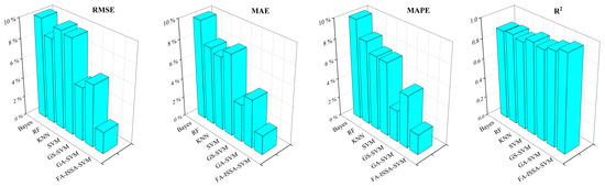 Next, to further verify the prediction performance of these models, multiple indicators of the RMSE, mean absolute error (MAE), mean absolute percentage error (MAPE), and goodness-of-fit (R2) were employed for the evaluation. Compared with Bayes, RF, KNN, SVM, GS-SVM, GA-SVM, and the FA-ISSA-SVM model show optimal diagnostic accuracy with high stability; specific data are shown in Figure 14.