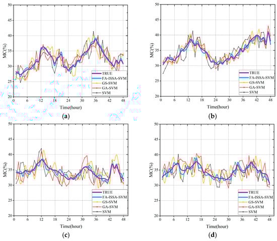 The annual MC of living wood trunks is worthy of attention, as MC statuses change throughout the day. August is a relatively important stage for the growth and development of trees, and the physiology of trees is very active. Therefore, we selected two consecutive days (21 August 2022 to 22 August 2022) when the meteorological environment (including rainfall, wind speed, wind direction, air pressure, etc.) has little change and conducted continuous monitoring for 48 h. The diagnostic system was set up on four different tree species. We envisagd that the FA-ISSA-SVM can maintain the best generalization ability and robustness even in the most active stage of the physiological activity of trees, which means that the FA-ISSA-SVM has good applicability under different working conditions. The MC predicted by different models and the calibrated real MC value of the four tree species are shown in Figure 15.