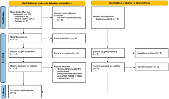 The inclusion criteria for this review encompassed original articles, case reports, technique reports, pilot studies, and clinical research that discussed the utilization of CAD/CAM or 3D printing technology in the manufacturing of fixed or removable space maintainers specifically for pediatric patients. Published articles without any language restrictions were included.