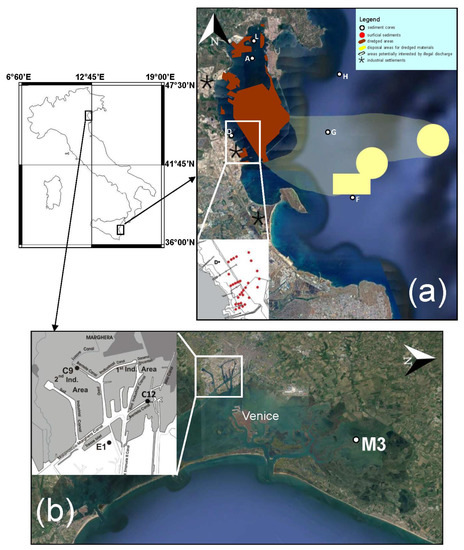 - Bellucci, L.G.; Frignani, M.; Paolucci, D.; Ravanelli, M. Distribution of heavy metals in sediments of the Venice Lagoon: The role of the industrial area. Sci. Total Environ. 2002, 295, 35–49. [Google Scholar] [CrossRef] [PubMed]