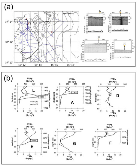 (a) Map of the seismic survey realized in the Augusta Bay and Harbor, together with CHIRP profiles and seismic surface reflectivities relative to L, A, H, and G core locations; (b) 210Pb and 137Cs activity−depth distributions for cores L, A, D, H, G, and F. Profiles are presented also vs. years of deposition, calculated from the S values. When detected, the 137Cs 1963 peak is indicated. Modified from [27].