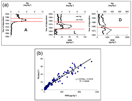 (a) Hg concentration vs. year of deposition in cores A, L, and D. HCB concentration profile for core L is also reported. The dotted lines encompass the period from the beginning of industrialization in the area (early 1960s) to the promotion of the first remediation measures (late 1970s); (b) Hg and HCB correlation in surficial samples collected in 2005 and in surficial layers of cores collected in 2003. The product moment and partial correlation coefficient R is 0.93, significant at p < 0.0005, and calculated with Statistica 7.0 StatSoft ©). Modified from [27].