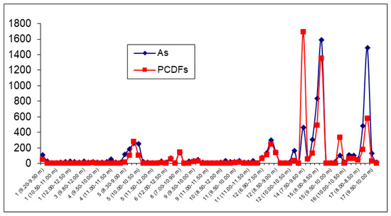 Association between As peaks (µg g−1) and PCDD/Fs (µg kg−1) in sediments of the industrial canals Nord and Brentella. Data are from [67].