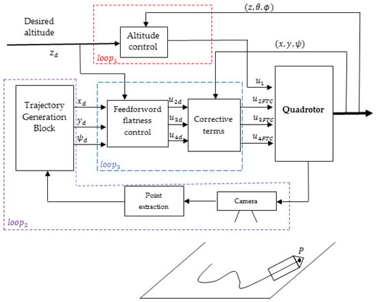 The control strategy of the quadrotor for ensuring the tracking of a vehicle is given in Figure 1. The quadrotor takes a desired altitude, , and as soon as it detects the vehicle to be pursued, it will join it and ensure its tracking. The quadrotor used in this work is equipped with a camera with a stabilizer that keeps this camera upright during its movement. Once we have generated the movements necessary for the quadrotor to ensure the tracking of the vehicle, a flatness control technique is proposed to carry out this target.
