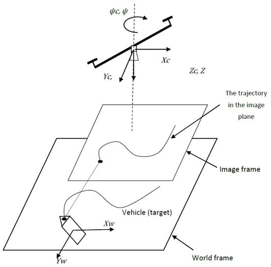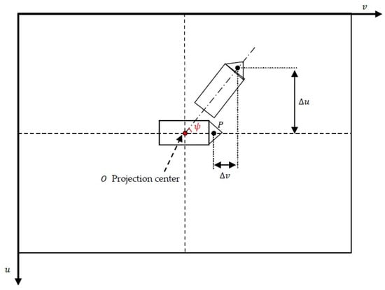 Since we know , we can deduce the displacements (, ) from the coordinates of a single point, , of the vehicle (the target). This point can be chosen in an arbitrary way, belonging to the vehicle but other than that which coincides with the center of projection of the camera because it is invariant to the rotation according to the axis .