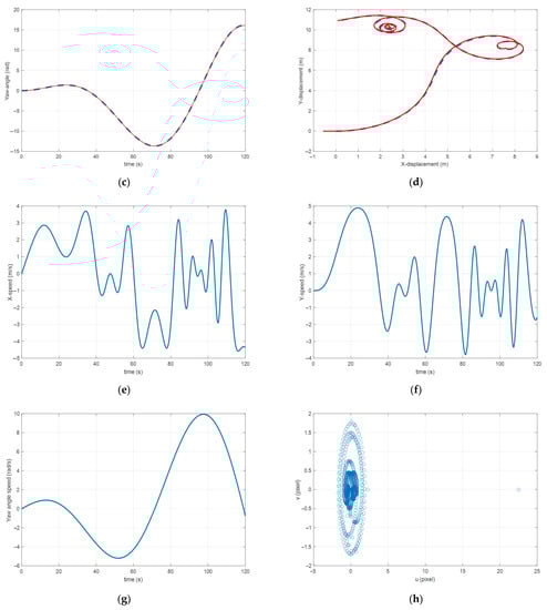 The simulation results are given in Figure 6. Figure 6a–d illustrate the displacement along the - and -axes as well as the orientation along the -axis, both real and generated by the visual servo loop. Figure 6e–g show linear translational velocities and angular rotational velocities, respectively. It is clear that despite variations in vehicle speed, the desired trajectory is followed perfectly. Figure 6h shows the continuous detection of point in the image plane along the trajectory. It is obvious that the object always remains in the field of view of the camera. In a practical situation, it would be possible to adjust the altitude of the quadrotor to widen the field of view because our method allows this variable (the altitude) to be independently controlled from the others.