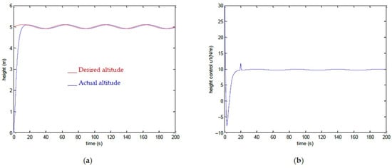 To validate the effectiveness of the global tracking strategy, we will consider the following experiment. The quadrotor takes off to reach a given altitude. The vehicle (target) is located just below the quadrotor. At a given moment, it begins to move according to a variable dynamic. As mentioned above, to ensure the pursuit or tracking of the vehicle, we have made three servo loops. In this section, we detail the simulation results of each loop. We include in this experiment the fact that the quadrotor cannot maintain a constant altitude throughout its flight. We choose the descriptor point such that its projection on the image plane is located on the horizontal axis which passes through the center of projection. This point will be less affected by the displacement along the -axis. We impose a variable altitude given by the following expression: for . The control law responsible for altitude control is given by Equations (3) and (5). The parameters of Equation (5) are chosen following experimental tests: . The simulation results are given in Figure 7.
