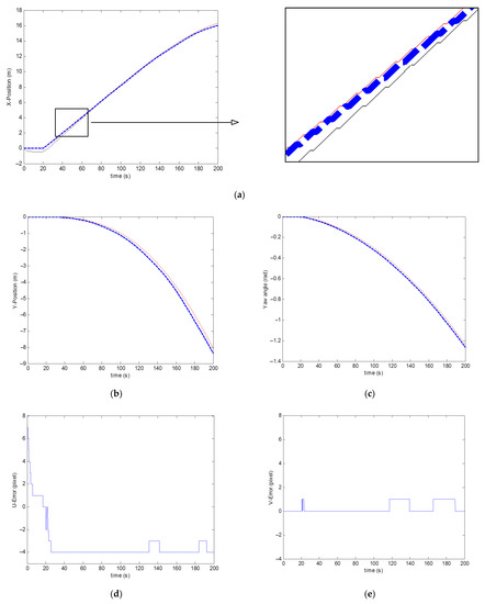 The simulation results are given by Figure 8. Figure 8a–c represent, respectively, the actual trajectory (displacement along , displacement along and orientation along the -axis) performed by the vehicle, the trajectory generated by the visual servo loop and the trajectory produced by the quadrotor using flatness control. We notice that the visual servoing algorithm generates a trajectory faithful to the real trajectory carried out by the vehicle (target). Flatness control ensures exact tracking of the generated trajectory. The evolution of the error in pixels between the position of the point in the image plane and the desired point is given in Figure 8d,e. The evolution of the roll angle and the pitch angle, respectively, are given in Figure 8f,g. We notice that these two variables remain sufficiently small during the trajectory tracking.