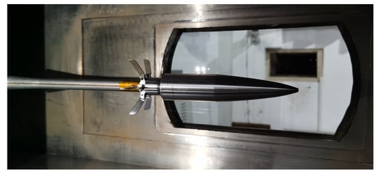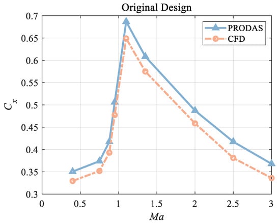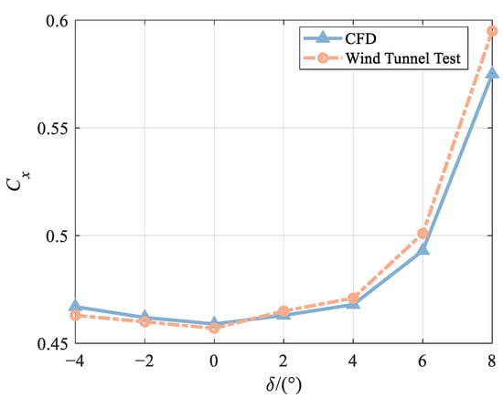 To ensure the reliability of the CFD numerical calculation method, the study first examines grid independence (as shown in Figure 5 and Table 2). The results in Table 2 demonstrate that the simulated values of the drag coefficient Cx under different grid density schemes are highly consistent, confirming the reliability of the CFD numerical method. Additionally, the accuracy of the CFD calculation results is evaluated using wind tunnel experimental data. The experimental model involves a 1/4 scale model of the projectile. The experimental wind tunnel is a downdraft temporary impact closed high-speed wind tunnel, with an experimental section size of 0.3 m × 0.3 m and a length of 0.6 m. The available Mach number range is 0.5–4.5. The model is supported and the angle of attack changes through the wind tunnel’s angle of attack mechanism. A 6-component strain balance is used to measure the force and torque of the model along the three coordinate axes. The experimental Mach number Ma is 2, and the angle of attack varies from −4° to 8°. The experimental model installation diagram is shown in Figure 6. By comparing the CFD simulation values with the wind tunnel experimental values under the grid scheme 1 (Ma = 2), the study evaluates the accuracy of the CFD calculation. As shown in Figure 7, the variation trend of the simulated and experimental values of the drag coefficient is generally consistent. Both increase nonlinearly with an increasing angle of attack, and the error between the two increases with an increasing angle of attack. The maximum relative error is approximately 0.02, indicating that the CFD numerical method can accurately solve the projectile’s aerodynamic parameters. Furthermore, it can be used to evaluate the error between accurately calculated aerodynamic parameter values and those calculated using the PRODAS engineering algorithm. Figure 8 presents a comparison between the drag coefficient calculated using PRODAS and CFD at δ = 0° for Ma ∊ 0.4~3. The results indicate that the CFD-calculated drag coefficient values are slightly lower than the corresponding PRODAS engineering calculations within this range, with a maximum difference of approximately 0.912 and a minimum difference of approximately 0.943. Considering both the numerical results obtained from CFD and the structural changes in the fins during the design process, this paper proposes an optimization design to ensure the robust performance of pulse correction projectiles within the variation range of drag correction coefficient .