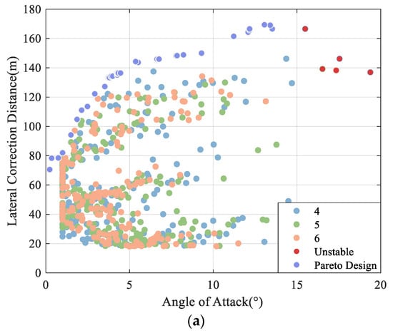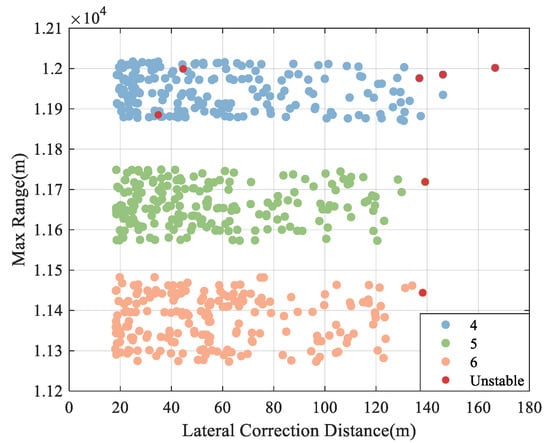 In this equation, c, r, and a correspond to the representative lateral correction distance, maximum range, and maximum angle of attack of the target, respectively. The symbol (^) denotes that this value is predicted by the DK surrogate model. In the design process, it is not required for the three performance criteria to be strictly mutually exclusive. In the design process, 600 sample points were generated using Latin hypercube design (LHD) as training samples and an additional 30 test samples were generated. The number of samples to select is based on the expected prediction accuracy and computation. The distribution of performance indicators, namely lateral correction distance, maximum range, and maximum angle of attack, categorized according to the number of fins, is shown in Figure 9 and Figure 10. The red dots in the figures indicate unstable points in the design (). It can be observed that reducing the number of fins can increase the range effectively. However, an improper design of the number and location of fins may cause the center of pressure and center of gravity to be too close, resulting in the static stability reaching the critical value. Moreover, when the projectile is subject to pulse forces during its controlled trajectory, it becomes more challenging to meet the dynamic stability requirements. Additionally, larger correction capabilities often require more significant pulse energy consumption, which puts higher demands on the projectile’s flight stability.