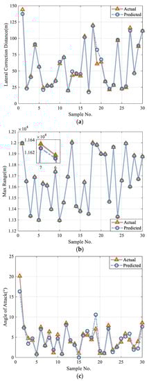 Actual versus predicted performance between 6 DOF and DK model. (a) Lateral correction distance versus sample no. (b) Max range versus sample no. (c) Angle of attack versus sample no.