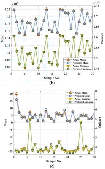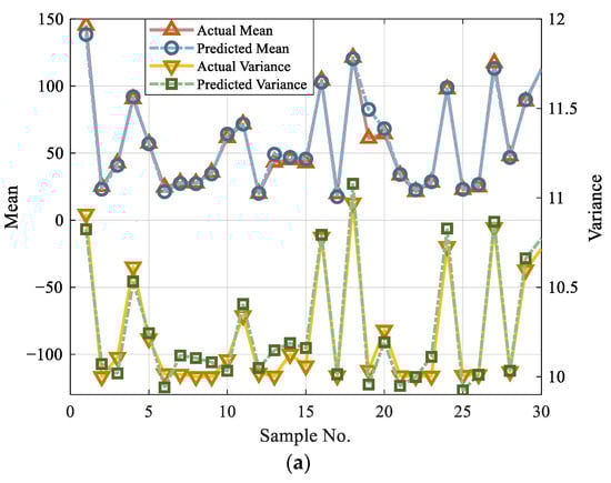 The symbol (i = c, r, a) represents the variance prediction value of the target performance by the SK model. The definitions of other related symbols are consistent with those in Formula (4). To ensure consistency with the optimization design results obtained from the DK model, we kept the LHD sample space and MOSSA parameter settings unchanged from Section 3.2. Unlike constructing a deterministic model, a random surrogate model was built by uniformly repeating the sampling process five times within the aero_factor change interval at each sample point. The performance mean and variance at different design variable points were used as input variables for the SK model to obtain the response mean and variance of the design variables at unknown locations. Similarly, we selected 30 test samples outside of the 600 design samples to verify the rationality of the SK model. Figure 12a–c depict the comparison curves between the means and variances predicted by the SK model and the actual computational results. The results demonstrate a close match, indicating that the accuracy of the constructed SK model is adequate for robust optimization design in the future.