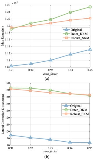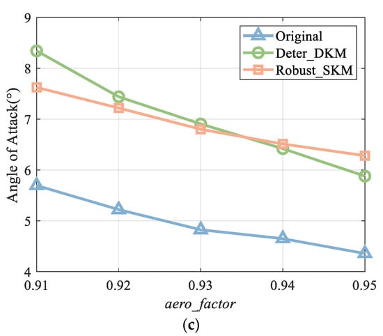 Divergent characteristics of design performance. (a) Max range versus aero_factor. (b) Lateral correction distance versus aero_factor. (c) Angle of attack versus aero_factor.