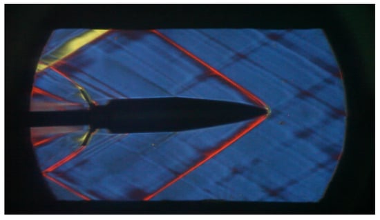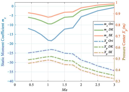 To validate and provide reference data for the optimized projectile aerodynamic layout performance, wind tunnel experiments and CFD simulations were conducted on the deterministic and robust optimization schemes. The wind tunnel experimental model was designed in sections, and different aft fin components could be obtained by replacement. The test model parts and the experimental schlieren image are shown in Figure 15 and Figure 16, respectively. To facilitate comparative analysis of the design schemes, the CFD simulation conditions were consistent with scheme 1 in Figure 5a. The comparison between the wind tunnel experimental drag coefficient and the CFD drag coefficient under different operating conditions for the design scheme is shown in Table 5. The pressure distribution on the fin surfaces of the original configuration and the optimized design at δ = 0° and a Mach number of 0.6 is depicted in Figure 17a–c. The optimized design shows a decrease in the pressure values on the fin surface and a weakening of the surface shock wave intensity compared to the original design, as seen from Figure 17. This reduction is attributed to the decreased number of fins and the windward surface area, which effectively reduce the drag on the projectile. Furthermore, Figure 18 compares the curves of the fin surface roll moment coefficient () and the roll damping moment coefficient () obtained from CFD calculations. The optimized design exhibits a larger resultant moment vector in the roll direction due to an increase in the lead edge cant angle. The fin cant angle is an important factor that affects the balance spin rate of the projectile, and therefore its flight characteristics and the correction efficiency of the trajectory. However, it is not the only determining factor. Figure 19 presents curve diagrams of the static moment coefficient () and the center of pressure () as a function of the Mach number, obtained from CFD simulations. The optimized design adjusts the fin installation position to move closer to the projectile’s nose, which reduces the distance between the center of mass and the center of pressure, thereby decreasing the static stability and enhancing the trajectory correction capability. It should be noted that the static stability of a pulse correction projectile should not be excessively high, as it may adversely affect its trajectory correction performance, nor too low, as it may cause flight instability. Therefore, the fin installation position should be rationally arranged based on the overall design requirements during the design process.