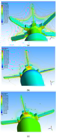 Pressure distribution on the empennages of different empennage models (). (a) Original design. (b) Deter DKM. (c) Robust SKM.