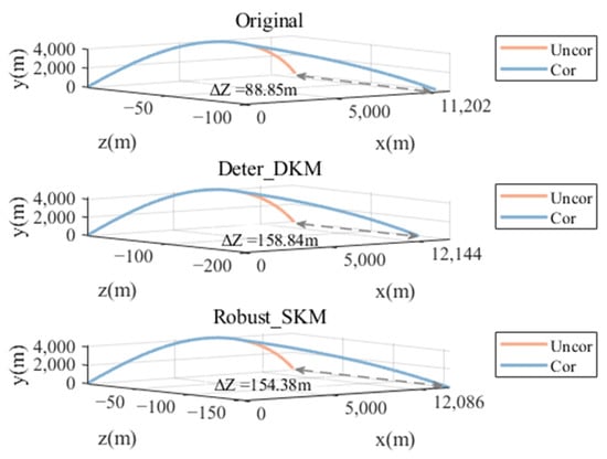 Based on the aerodynamic parameters obtained from CFD, Figure 20 and Figure 21 present the corresponding flight trajectories and angle of attack curves for the original configuration and the two optimized designs. In these figures, “Uncor” denotes an uncontrolled trajectory, while “Cor” denotes a controlled trajectory. It is evident that both sets of optimized designs fulfill the requirements for stable flight. This study’s simulation results have demonstrated the practical significance of robust design in improving the performance of pulse correction projectiles.