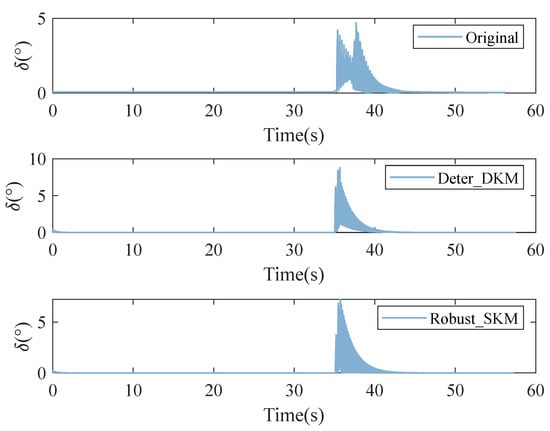 The design of pulse correction projectiles requires an optimal solution that changes with variations in target performance. Improvements in one performance indicator often come at the expense of others. Due to the complexity of the influence of design variables on results, the MOSSA algorithm based on non-dominated sorting is used to seek the Pareto optimal solution using both the DK and SK surrogate models. The flight stability of the projectile is handled using the penalty function method, which applies a penalty term on individuals that violate the constraint of the angle of attack amplitude. The optimization process uses a population size of 80 and a maximum number of iterations of 500 to eliminate accidental errors. Each algorithm is independently run 30 times. The Pareto design sets based on the DK and SK models are shown in Figure 13a,b, respectively. The obtained Pareto solutions all fall on the edge of the LHD experimental samples, indicating that all target performance indicators have been improved. It is observed that there is a conflicting relationship between the maximum angle of attack and the lateral correction distance. Specifically, the larger the lateral correction distance, the larger the maximum trajectory angle of attack. In the decision-making process of the scheme, both the demands for correction capability and flight stability should be comprehensively considered. However, the maximum range and lateral correction capability, as discussed at the beginning of the design, are not strictly mutually exclusive or unrelated. Nonetheless, when improving the maximum vertical correction capability as the target function, the situation is different. Therefore, a better solution can be selected from the Pareto optimal solutions under the premise of meeting dynamic flight stability in the decision-making process of pulse correction projectiles. To conduct a specific performance evaluation of the deterministic optimization design based on the DK surrogate model (Deter_DKM) and the robust optimization design based on the SK surrogate model (Robust_SKM), design points with similar performance indicators from the Pareto solution set are selected for comparative analysis. Table 3 presents the values of the Pareto solutions for deterministic optimization and robust optimization. Table 4 provides a detailed comparison of the corresponding Pareto design solutions in terms of performance results obtained from 6 DOF calculations. The mean and variance of the lateral correction distance, maximum range, and maximum angle of attack within the aero_factor change interval are represented by , respectively. Both optimization results have shown a significant improvement in performance at the design points compared to the original configuration. According to Table 4, the deterministic optimization solution of Deter_DKM has increased the mean value of the lateral correction distance by approximately 78.25% and the mean value of maximum range by approximately 8.40% but has increased the mean value of maximum angle of attack by approximately 2.74°; this is within the aero_factor change interval. Similarly, the robust optimization solution based on SK has increased the mean value of the lateral correction distance by approximately 74.27%, the mean value of the maximum range by approximately 7.89%, and the mean value of the maximum angle of attack by approximately 2.13°. The performance of the two optimization solutions is relatively close, and the deterministic optimization solution has a slight advantage in performance indicators. Figure 14a–c present a comparison of the divergence curves for the target performance, and it is evident that the performance divergence characteristics of the robust optimization scheme based on the SK model are superior. As the uncertain design in this study mainly focuses on small-scale fluctuations in the drag coefficient, Figure 14 shows that compared to the lateral correction distance and maximum angle of attack, the robust optimization scheme improves the divergence characteristics of the maximum range more significantly.