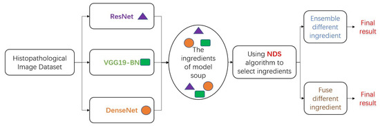 Different strategies have been proposed to solve the contradiction between the lack of training data and computing resources and the pursuit of model performance. One widely used strategy is transfer learning. It takes the approach of further training (fine-tuning) on top of a well-trained model, e.g., models trained on ImageNet. A common practice is to train only the weights of the last few fully connected layers while fixing the weights of the remaining layers. By using a pre-trained model, one can make full use of its architecture and weights, resulting in significant reductions in the design and training costs of the model. This strategy has been widely used in work on histopathological image analysis [10,11,12,13,14,15]. However, setting the model hyperparameters becomes a challenge when using this strategy to train or fine-tune the pre-trained model. Common hyperparameters include the learning rate, weight decay rate, batch size, data augmentation strength, etc. Hyperparameters have a direct impact on the training effect of the model. The optimal hyperparameter setting is usually difficult to obtain. Instead, people determine hyperparameter settings based on experience or by using a grid search on a small verification set. However, the grid search requires a lot of computational resources and may not reach global optima. Another strategy is model ensemble. The main idea of model ensemble is to train several base models with diversity, and then perform majority voting or weighted voting on the output of these models to obtain the final results. By using different training sets, changing the training hyperparameters, using different types of optimizers, etc., the diversity between base models can be improved. Model ensemble can combine multiple base models with suboptimal performance into a model with strong overall performance, which can lead to better results than a single model, provided that the diversity among the base models is ensured. Although the model ensemble strategy avoids the computationally expensive hyperparameter search, it greatly increases the inference cost of the model. This is because each test sample needs to be fed to each base model for inference and, hence, the running time is proportional to the number of base models. This limits the application scope of the model ensemble methods, especially in low-specification terminals or mobile devices.