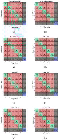 Confusion matrix of the models based on ResNet. (a) CLR-Aver-Soup (SWA); (b) CLR-DDWA-Ensemble; (c) CLR-DDWA-Soup; (d) LR = ; (e) LR = ; (f) LR = ; (g) LR-Aver-Soup; (h) LR-Ensemble.